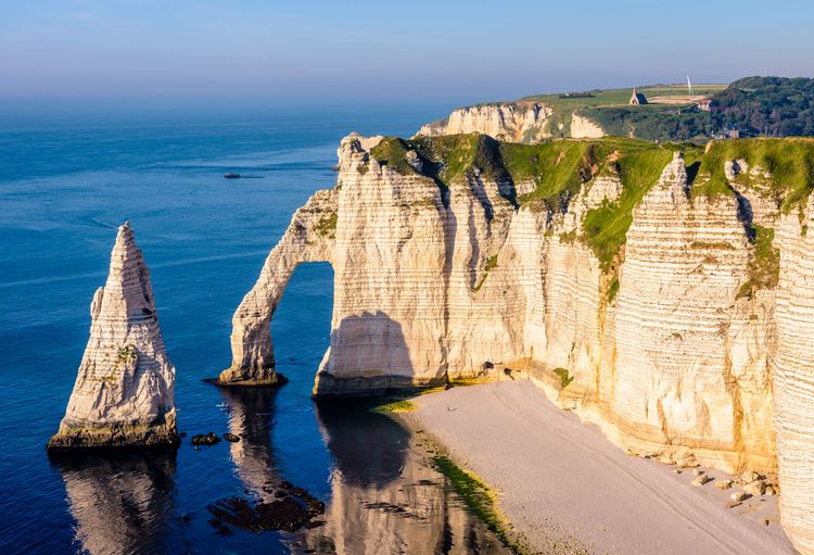Como Deauville, con su festival de cine, su paseo marítimo, sus grandes hoteles y sus carreras, que se abre a la fabulosa Côte de Nacre desde Caen y a la Côte Fleurie desdeTrouville hasta Honfleur. Los acantilados de Etretat** no se quedan atrás. Estos últimos han inspirado a muchos artistas famosos, empezando por Maurice Leblanc y su célebre personajeArsène Lupin, que esconde sus tesoros en laaguja hueca. Pero también a Monet y su famoso cuadro de la Manneporte d'Etretat.