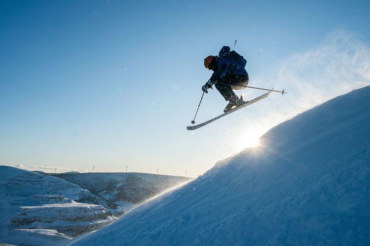 Silueta de un hombre esquiando en el Chocs Chic en Quebec Canada