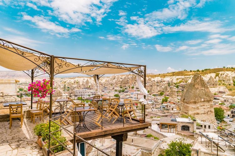 No olvide probar la cocina local durante su estancia en Capadocia. Muchos restaurantes tienen terraza con vistas, para que pueda disfrutar del paisaje, como aquí, en el pueblo de Göreme.