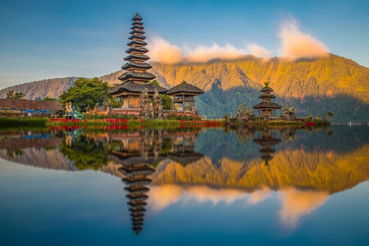 Una ligera bruma surge del lago, envolviendo el templo y dando al conjunto un aspecto surrealista. Este templo está construido sobre un lugar sagrado y un centro de rituales religiosos que datan del periodo megalítico. Está dedicado a la diosa Danu, considerada en balinés como la soberana del agua, los lagos y los ríos.