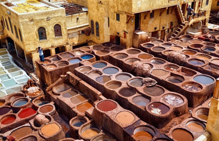 - © Alessio Catelli / shutterstockEs el lugar más típico de la ciudad, donde se puede ver a los curtidores introducir pieles de animales en cubas llenas de tintes naturales. Es un espectáculo colorista que permite conocer la técnica milenaria de mezclar excrementos de paloma con cal en tinajas. A la entrada de la curtiduría, un vendedor le dará una ramita de menta para que respire aire fresco mientras observa este panorama que nos transporta al siglo VIII.