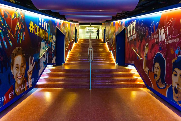 Túnel de jugadores del estadio Camp Nou del FC Barcelona. Una parte del recorrido en la que podrás ver palcos de prensa, vestuarios, banquillo de suplentes, asientos panorámicos, etc.