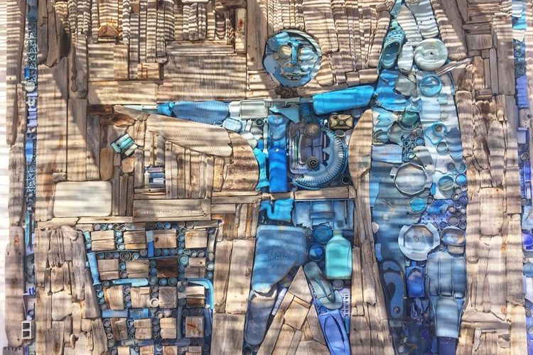 Mural hecho con deshechos reciclado encontrado en el mar.