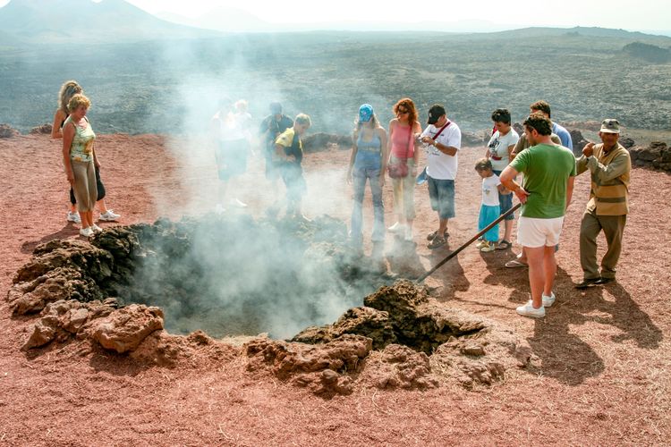 El Parque Nacional de Timanfaya es la principal atracción de Lanzarote. Es un paisaje lunar o marciano, nada terrenal. Es el escenario de Viaje al Centro de la Tierra, donde se puede comer pollo a la brasa directamente en las entrañas de la tierra, y viajar en guagua especial o en camello: es el punto culminante de cualquier visita a la isla canaria de Lanzarote.