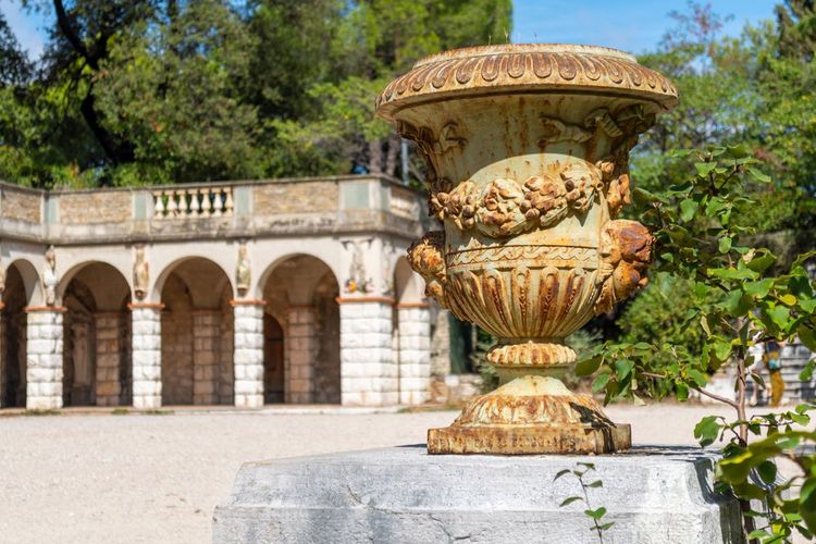Jarrón antiguo frente a las arcadas romanas de Niza.