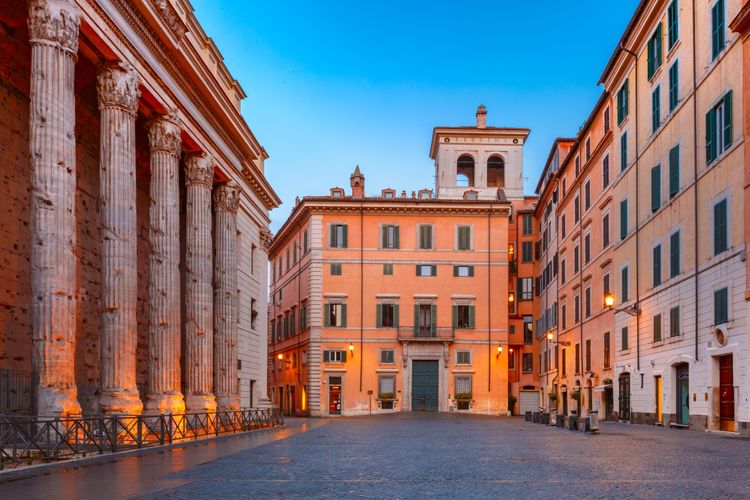 En el barrio del Panteón, en pleno centro de la ciudad, la Piazza di Pietra alberga la fachada histórica del Templo de Adriano. De este lugar dedicado en honor del emperador quedan 11 columnas, que crean un atractivo para esta pequeña plaza que a veces se pasa por alto en favor de sus plazas hermanas situadas a pocos metros.
