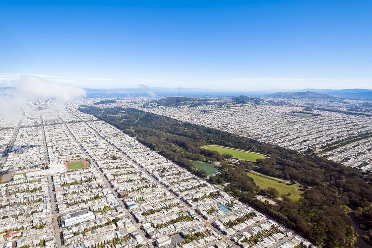 Creado en la década de 1960, el Golden Gate Park guarda un asombroso parecido con el Central Park de Nueva York. Esto es perfectamente normal, ya que este último sirvió de modelo, y su diseño se encargó al paisajista que diseñó Central Park: Frederick Law Olmsted. Es una franja verde de 5 km de largo en pleno centro de la ciudad. Ligeramente más grande que su homólogo neoyorquino, el parecido entre éste y el parque californiano es aún más sorprendente desde el aire.
